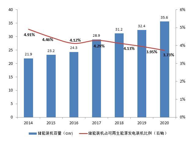 本來配套的儲能就缺,近幾年隨著新能源發(fā)電跨越式發(fā)展,儲能的跛腿情況更加嚴(yán)重。根據(jù)CNESA數(shù)據(jù),截至2020年末我國已投運(yùn)儲能項(xiàng)目累計(jì)裝機(jī)規(guī)模35.6GW,占可再生能源發(fā)電裝機(jī)比重僅為3.73%,顯然儲能的裝機(jī)滯后可再生能源裝機(jī)。