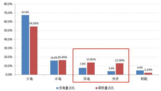 究其原因,光伏和風(fēng)電這類可再生能源是典型的間歇性能源。什么意思?以風(fēng)電作為例子,一般在凌晨是風(fēng)力發(fā)電的高峰,但卻是用戶用電的低峰,發(fā)那么多電,用不完;等到早上用電高峰來了,結(jié)果風(fēng)停了,用戶又用不上風(fēng)電。這也是為什么風(fēng)電、光伏的發(fā)電量與裝機(jī)量占比存在較大差異。