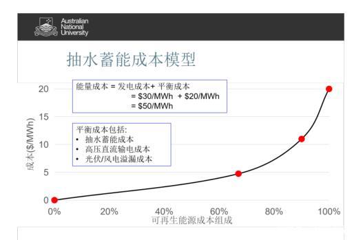 根據(jù)澳洲國立大學(xué)研究團(tuán)隊(duì)的成本模型數(shù)據(jù):使用100%可再生能源電力系統(tǒng)發(fā)電成本約$30/MWh,平衡成本約$20/MWh (含抽水蓄能、高壓直流輸電和光伏/風(fēng)電溢漏成本) ,總度電成本約為$50/MWh (約合人民幣0.32元/KWh) 。