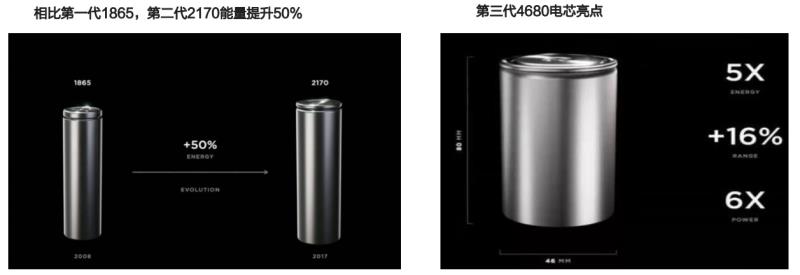 2020年9月22日,特斯拉CEO馬斯克在特斯拉電池日上發(fā)布了第三代4680電芯。相比于第二代2170電芯,4680電芯的能量提升了5倍,輸出功率提升6倍,配合著新的裝配工藝,可以讓電動車續(xù)航提升54%,每千瓦時電池價格下降56%,生產(chǎn)成本降低69%。