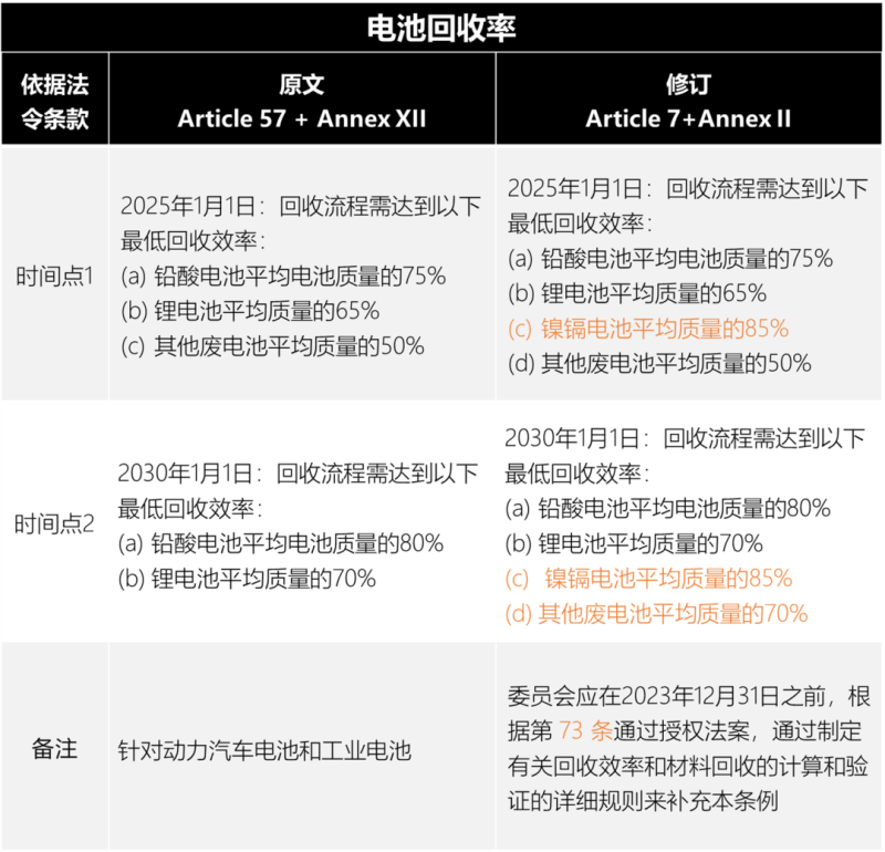 在電池回收效率和材料回收率措施方面,修訂條款將技術(shù)文件中披露回收鈷、鉛、鋰、鎳含量的時(shí)間要求提前至2025年7月1日。同時(shí)對(duì)電池的回收效率以及電池金屬材料回收率做出了更嚴(yán)格的要求,具體如下表所示。