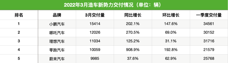 3月,小鵬汽車交付量突破1.5萬輛再次奪得月銷量冠軍,哪吒汽車交付量突破1.2萬輛奪得亞軍,理想汽車交付量為1.1萬輛,位列第三位。此外,繼“蔚小理哪”后,零跑汽車3月交付量也突破萬輛,首次躋身新勢力月銷量前四榜單,而蔚來在3月交付量不足1萬輛,在造車新勢力3月銷量榜單中排名第五。