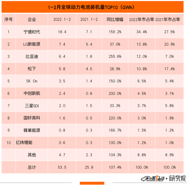 1-2月,全球新能源汽車裝機量53.5GWh,同比增長超1倍。寧德時代、LG新能源、比亞迪分列前三。松下被比亞迪反超,排名下降至第四,SK On穩(wěn)居第五;中創(chuàng)新航超越三星SDI躋身第六,繼去年11月上榜后,億緯鋰能再次上榜躋身1-2月總榜第10。