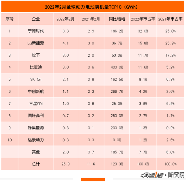 根據(jù)韓國市場研究機構(gòu)SNE Research數(shù)據(jù)顯示,2022年2月,全球動力電池裝機量為25.9GWh,同比增長123.3%。寧德時代穩(wěn)居冠軍寶座,LG新能源獲得亞軍,松下以微小的差距再次領(lǐng)先比亞迪,奪得季軍。