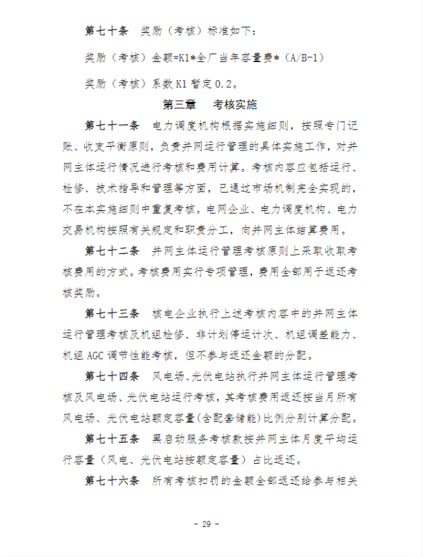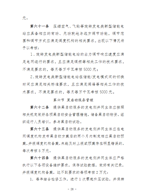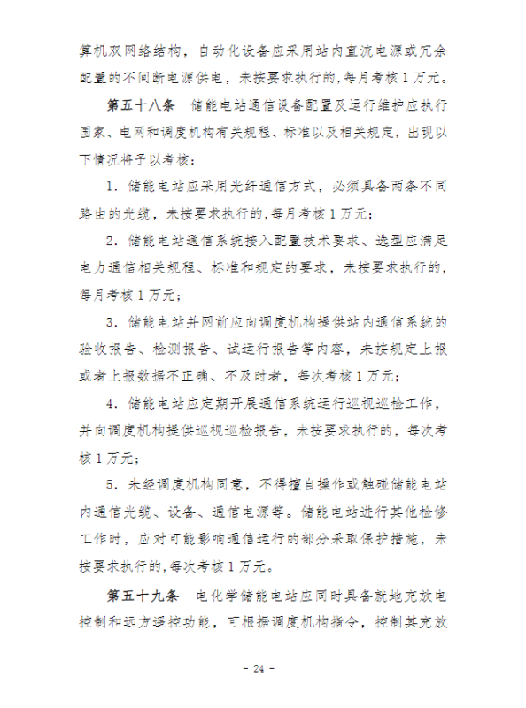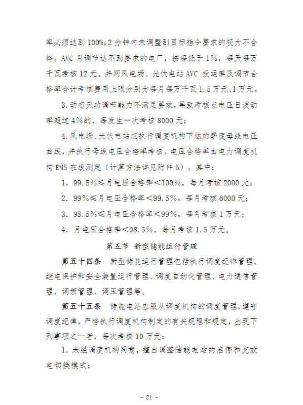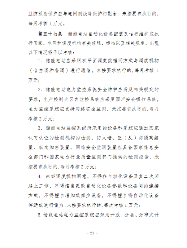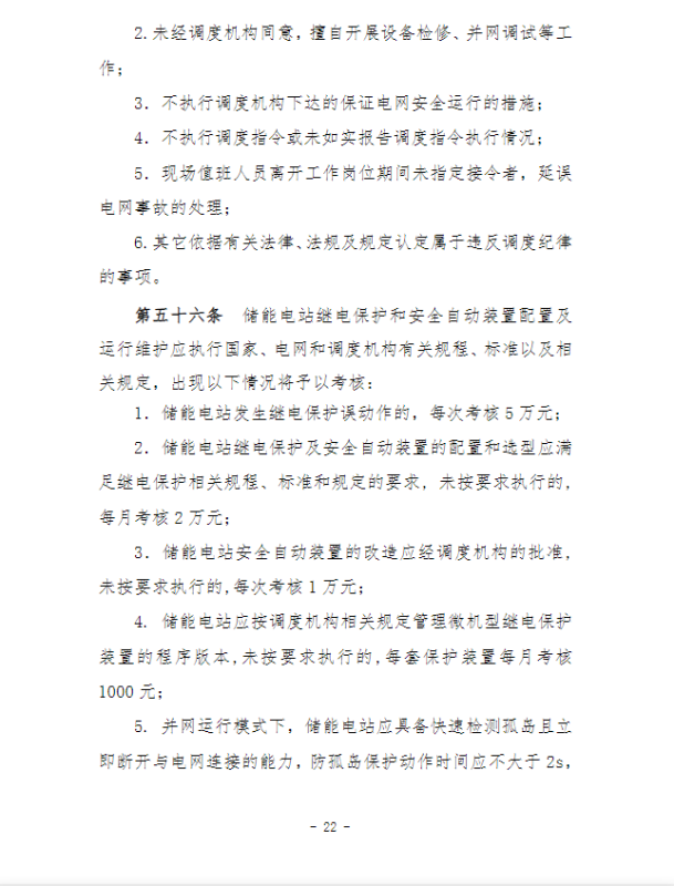 在并網(wǎng)運(yùn)行管理細(xì)則中,“新型儲(chǔ)能運(yùn)行管理”、“抽水蓄能電站可用率管理”章節(jié),明確要求儲(chǔ)能電站應(yīng)服從調(diào)度機(jī)構(gòu)的調(diào)度管理,出現(xiàn)各類(lèi)違規(guī)情況將需要支付考核費(fèi)用:如出現(xiàn)擅自調(diào)整儲(chǔ)能電站的啟停和充放電切換模式、擅自開(kāi)展設(shè)備檢修并網(wǎng)調(diào)試工作、或值班人員離守延誤電網(wǎng)事故處理等情況,每次考核10萬(wàn)元;儲(chǔ)能電站發(fā)生繼電保護(hù)誤動(dòng)作的,每次考核5萬(wàn)元;儲(chǔ)能電站繼電保護(hù)及安全自動(dòng)裝置的配置和選型未按要求執(zhí)行的,每月考核2萬(wàn)元。