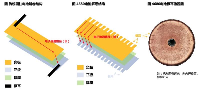 而根據特斯拉專利可以看到 4680 電池的結構中正負極上分布著均勻的極耳,這樣大大縮短了極耳間距,比如 2170 電池電子在集流體里流過整個卷繞極片的展向長度,路徑約 900 mm,而 4680 的正負極薄膜是 2170 電池的 4—5 倍,如果依然采用單極耳,那么電子的路徑會長達 3.8 米,內阻也會相應增加 4 倍,而全極耳的方案能讓這一路徑縮短為電池的高度,即 80 mm,根據特斯拉的介紹,4680 電池內阻發(fā)熱只有 2170 電池的五分之一。再加上全極耳大大增加了電流通路,這樣電子更容易在電池內部移動。