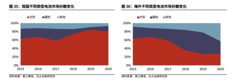 中國市場方形電池一枝獨秀,海外市場圓柱、方形、軟包三足鼎立