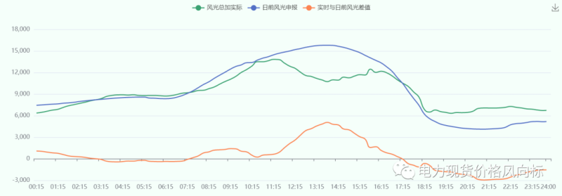 新能源發(fā)電中,風(fēng)電光伏總加日前申報(bào)功率全天平均值為9595.01MW,實(shí)際發(fā)電功率全天平均為9308.28MW。實(shí)時(shí)功率和日前申報(bào)功率,全天出現(xiàn)的平均偏差率為3.08%。