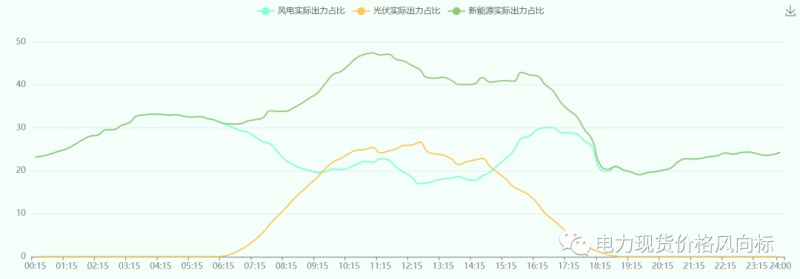 全天,新能源出力峰谷差率為2.46。新能源占統(tǒng)調(diào)發(fā)電比重的具體實(shí)時(shí)曲線(xiàn)如下圖所示:
