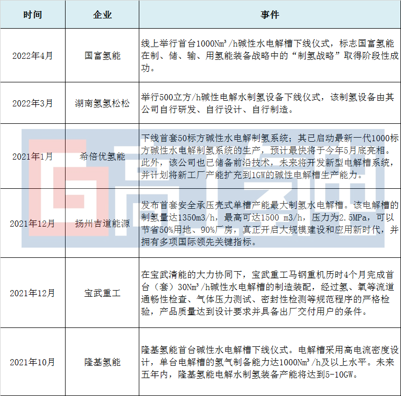 堿性水電解制氫,作為技術(shù)已經(jīng)比較成熟且居于主導(dǎo)地位的技術(shù)路線,前景可期,空間顯然將非常廣闊。基于這一驅(qū)動(dòng)因素,已經(jīng)有越來(lái)越多的企業(yè)開(kāi)始涌入這一賽道。以下是高工氫電梳理的近半年包含國(guó)富氫能在內(nèi)的涉足這一細(xì)分領(lǐng)域的企業(yè):