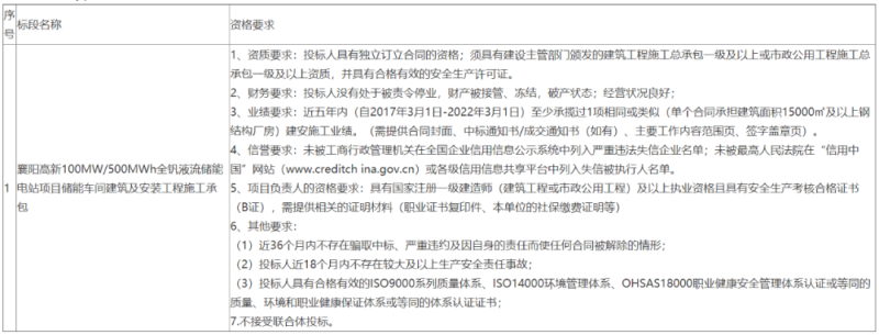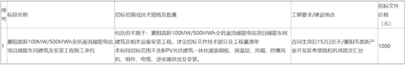 國家電力投資集團(tuán)有限公司湖北分公司襄陽高新100MW/500MWh全釩液流儲(chǔ)能電站項(xiàng)目?jī)?chǔ)能車間建筑及安裝工程施工承包招標(biāo)公告