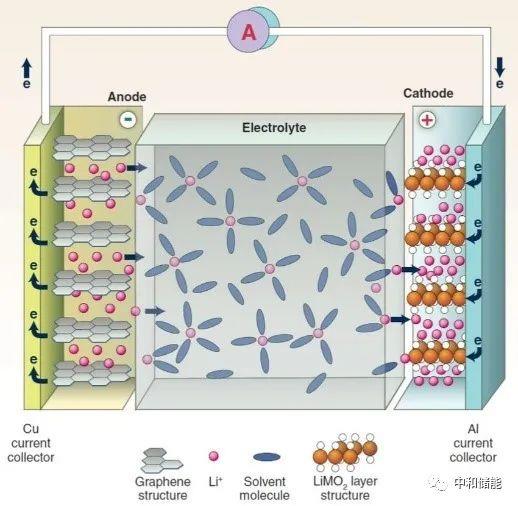 如下圖所示(以LiMO2[2]為例),鋰離子電池的工作原理可以概括為鋰離子在正負(fù)極之間的穿梭并進(jìn)行嵌入脫出的充放電過程。充電時,鋰離子從正極材料晶格脫出,經(jīng)過電解液到達(dá)負(fù)極材料并嵌入其晶格之中;而在放電時,又是負(fù)極材料中的鋰離子脫嵌后,經(jīng)過電解液重新嵌入正極材料,這種可逆的嵌入和脫嵌過程構(gòu)成了鋰離子電池的充放電過程。
