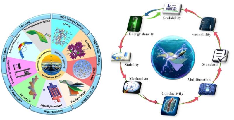 隨著科技的進(jìn)步,高柔性、便捷和輕薄的柔性可穿戴電子設(shè)備是電子產(chǎn)品發(fā)展的主流方向。為了實(shí)現(xiàn)整個(gè)設(shè)備的可穿戴性,需要開發(fā)相匹配的高柔性、輕質(zhì)量及小體積的供能器件。水系電池,顧名思義采用水作為電解質(zhì)溶劑,可從根本上解決易燃有機(jī)電解質(zhì)引起的安全問題,避免有機(jī)體系嚴(yán)格的制造條件、昂貴的電解質(zhì)成本,并且從根本上改善了電池體系的快充特性。柔性固態(tài)水系電池以其能量密度高、安全性好、成本低等獨(dú)特的優(yōu)點(diǎn),是柔性可穿戴電子設(shè)備的理想供能器件。如圖1所示,國內(nèi)外科研工作者對在柔性電極材料的制備、器件結(jié)構(gòu)的設(shè)計(jì)和柔性表征進(jìn)行了大量的研究,促進(jìn)了柔性固態(tài)水系電池的快速發(fā)展。