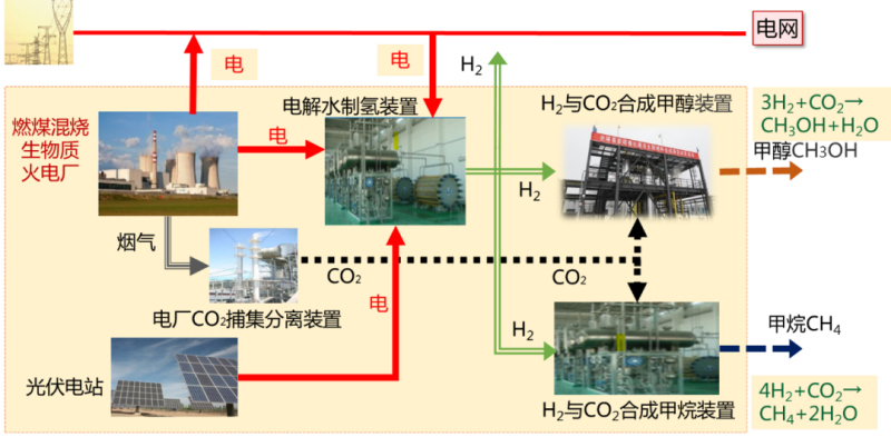 IEPU將電解制氫、可再生能源發(fā)電、甲醇/甲烷/氨合成、二氧化碳捕集等設(shè)備集成為一體,具有以下兩個方面的優(yōu)點:一是以電解制氫裝置作為可控負荷,通過與火電、水電等可調(diào)機組聯(lián)合運行,在單元內(nèi)部各子系統(tǒng)協(xié)同優(yōu)化的同時,實現(xiàn)與電網(wǎng)互動,成為具有高靈活性的虛擬發(fā)電單元,為高比例新能源電力系統(tǒng)應對長周期能源供需不平衡提供靈活性支撐;二是通過二氧化碳直接與氫氣合成,生產(chǎn)甲烷、甲醇等便于存儲、運輸?shù)木G色燃料或作為重要化工原料產(chǎn)品,一方面可規(guī)避大規(guī)模二氧化碳捕集后壓縮及封存的高額成本投入,另一方面借助合理可行的產(chǎn)品收益模式,有利于火電企業(yè)推廣應用二氧化碳捕集與利用技術(shù),在促進火電行業(yè)碳減排及轉(zhuǎn)型發(fā)展的同時,所生產(chǎn)的氫氣本身及與二氧化碳、氮氣合成生成的綠色燃料化工原料產(chǎn)品,也可為能源相關(guān)領(lǐng)域化石燃料和原料替代提供一定的來源補充。