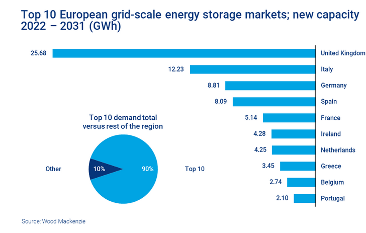在未來十年,歐洲前10大市場將增加73GWh儲能,相當于新部署的90%。