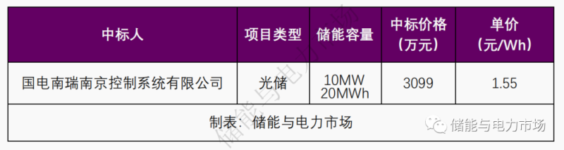 國電南瑞南京控制系統(tǒng)有限公司以總報價3099萬元,成為中標(biāo)人,該套儲能系統(tǒng)容量為10MW/20MWh,折合電價1.55元/Wh。