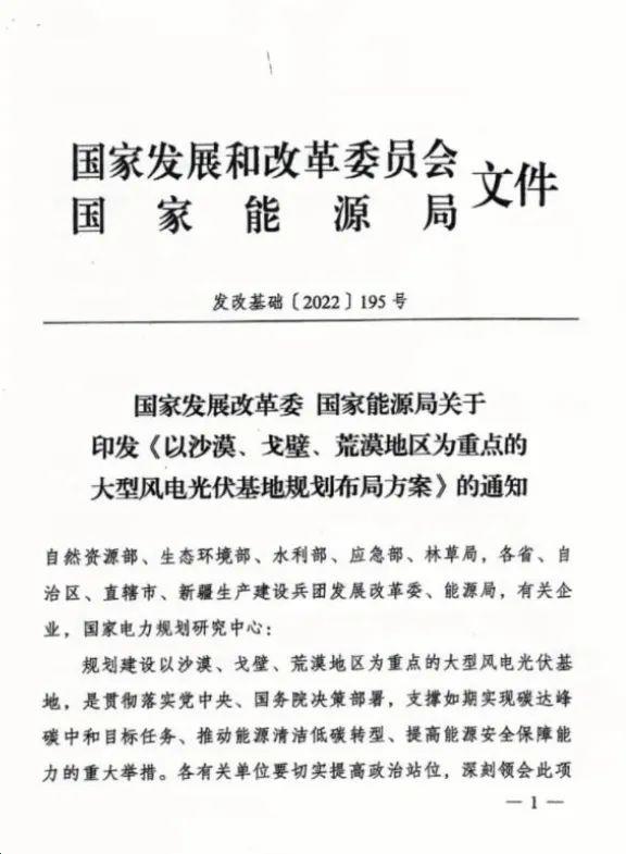 中國儲能網(wǎng)訊:國家發(fā)展改革委、國家能源局于近期發(fā)布關(guān)于印發(fā)《以沙漠、戈壁、荒漠地區(qū)為重點的大型風(fēng)電光伏基地規(guī)劃布局方案》的通知。