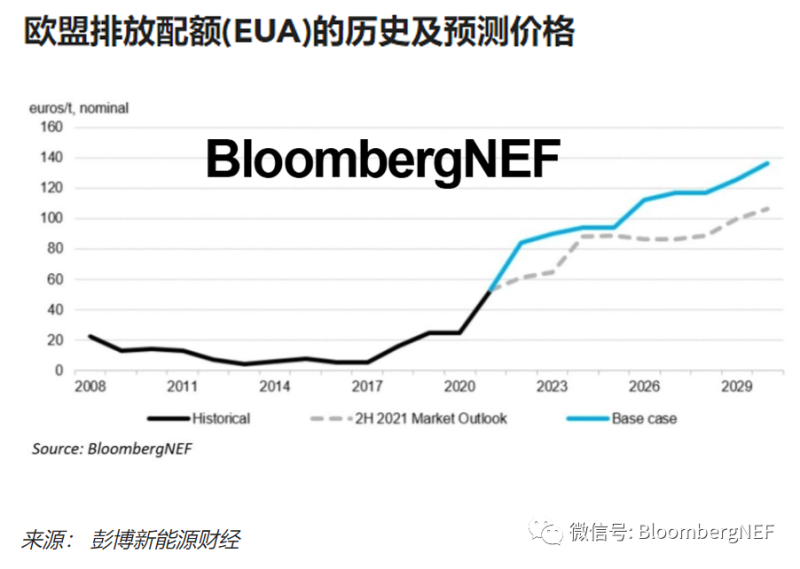 中國儲能網訊:我們依據歐盟排放交易體系(EU ETS)在第四個交易階段的預期變化,按目前的趨勢歐盟碳價格預計將在2030年達到創(chuàng)紀錄的每噸136歐元。“Fit for 55”系列立法提案是自2019年推出市場穩(wěn)定儲備(MSR)以來最為重要的政策改革,該提案提出了全新的線性折減系數和一次性調整方案,目的是讓碳市場與歐盟范圍內2030年減排目標上調至55%的舉措保持一致。在彭博新能源財經的基準情景中,2022年至2030年的平均碳價格為每噸108歐元,比2021年下半年市場展望預計的每噸83歐元要高出約30%。