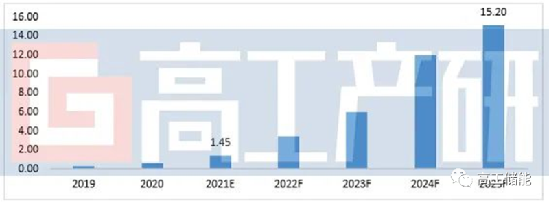 2019-2025年全球便攜式儲(chǔ)能鋰電池需求量及預(yù)測(cè)(GWh)