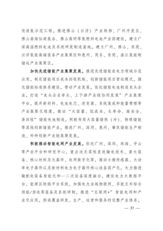 加快先進(jìn)儲(chǔ)能產(chǎn)業(yè)集聚發(fā)展。推進(jìn)先進(jìn)儲(chǔ)能在電力領(lǐng)域示范應(yīng)用,制定儲(chǔ)能項(xiàng)目成本回收機(jī)制、 創(chuàng)新儲(chǔ)能項(xiàng)目營(yíng)運(yùn)模式、 強(qiáng)化儲(chǔ)能標(biāo)準(zhǔn)體系建設(shè),帶動(dòng)產(chǎn)業(yè)發(fā)展。依托儲(chǔ)能電池制造龍頭企業(yè),打造 “龍頭企業(yè)牽頭、 上下游產(chǎn)業(yè)鏈協(xié)同發(fā)展” 產(chǎn)業(yè)集聚平臺(tái),提升新材料、 電池電芯、 逆變器、 系統(tǒng)集成和能量管理等產(chǎn)業(yè)集聚化程度,推動(dòng) “ 大容量、 低成本、 長(zhǎng)壽命、 高安全、 易回收” 儲(chǔ)能電池制造。積極布局大容量?jī)?chǔ)熱 (冷) 、 物理儲(chǔ)能等其他創(chuàng)新儲(chǔ)能產(chǎn)業(yè)。推進(jìn)廣州、 深圳、 惠州、 肇慶儲(chǔ)能生產(chǎn)制 造、 科研創(chuàng)新產(chǎn)業(yè)鏈集聚發(fā)展。