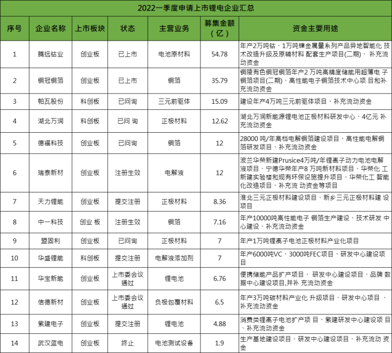 中國儲能網(wǎng)訊:4月6日,德勤中國發(fā)布數(shù)據(jù)顯示,2022年第一季度中國內(nèi)地IPO市場共有85只新股,融資規(guī)模達(dá)1799億元,在電池新能源領(lǐng)域,14家申請上市的鋰電企業(yè)有進(jìn)展。除去終止上市的武漢藍(lán)電,募集資金190億元。其中募集資金最多的是騰遠(yuǎn)鈷業(yè),募集54.78億元,在德勤中國一季度融資數(shù)據(jù)中名第四。