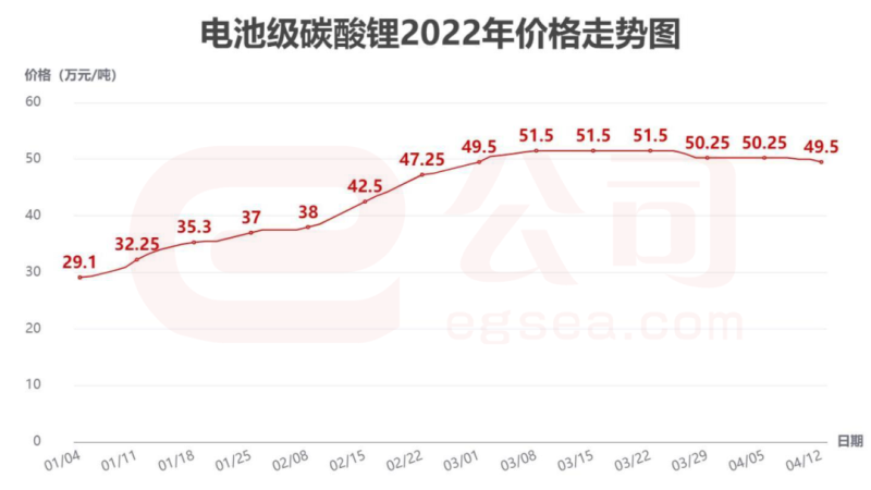 碳酸鋰價(jià)格在今年以來(lái)首次跌破50萬(wàn)元關(guān)口。鑫欏鋰電數(shù)據(jù)顯示,4月12日國(guó)內(nèi)電池級(jí)碳酸鋰均價(jià)相比前一日下跌5000元至49.5萬(wàn)元/噸。