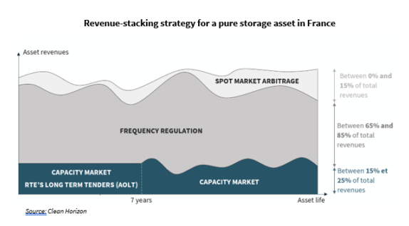 在法國(guó),有兩個(gè)替代市場(chǎng)可以提高儲(chǔ)能系統(tǒng)的盈利能力:容量市場(chǎng)和頻率調(diào)節(jié)市場(chǎng)。在任何時(shí)間點(diǎn),儲(chǔ)能系統(tǒng)都可以在現(xiàn)貨市場(chǎng)上進(jìn)行套利,也可以在這些市場(chǎng)中運(yùn)作——無(wú)論對(duì)電池儲(chǔ)能系統(tǒng)來(lái)說(shuō)都有利可圖。