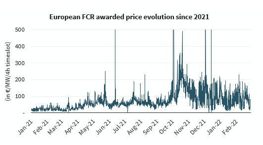 (2)頻率調(diào)節(jié)市場(chǎng)由一次性承諾組成的,即在一年中的任何一天的特定時(shí)間段內(nèi)遵循電網(wǎng)系統(tǒng)的操作指令(頻率遏制服務(wù)的持續(xù)時(shí)間為四個(gè)小時(shí),自動(dòng)頻率恢復(fù)儲(chǔ)備服務(wù)的持續(xù)時(shí)間為1小時(shí))。相關(guān)收入通過(guò)管理平臺(tái)上的拍賣系統(tǒng)確定。因此,已經(jīng)承諾進(jìn)入容量市場(chǎng)的儲(chǔ)能系統(tǒng)能夠在提供這些服務(wù)的時(shí)間之外進(jìn)行投標(biāo)。在2021年1月至2022年2月期間,頻率遏制服務(wù)的價(jià)格變化很大,4小時(shí)的可用性從100歐元/MW到1,600歐元/MW不等。