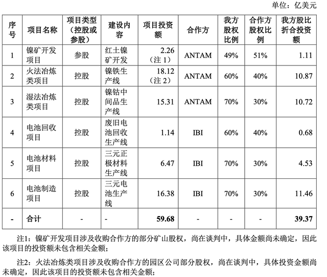 具體來看,6個(gè)子項(xiàng)目分別圍繞鎳礦開采和電池生產(chǎn)兩大塊。其中,與ANTAM合作的三個(gè)項(xiàng)目為鎳礦開發(fā)、火法冶煉類、濕法冶煉類,與IBI合作的三個(gè)項(xiàng)目為電池回收、電池材料和電池制造。除了鎳礦開發(fā)項(xiàng)目外,其余5個(gè)項(xiàng)目均由寧德時(shí)代控股。上述項(xiàng)目建設(shè)周期為5年。