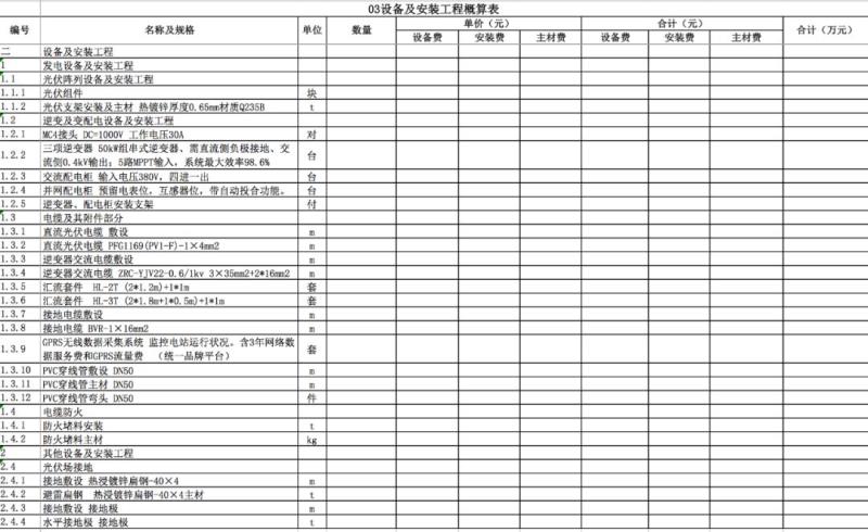 包含:發(fā)電設(shè)備(組件、逆變器、支架、電纜、接地)、升壓變電站設(shè)備、通信設(shè)備及其他設(shè)備的購買及安裝費(fèi)用。如下表所示。(某電站的電氣設(shè)備項目附后)