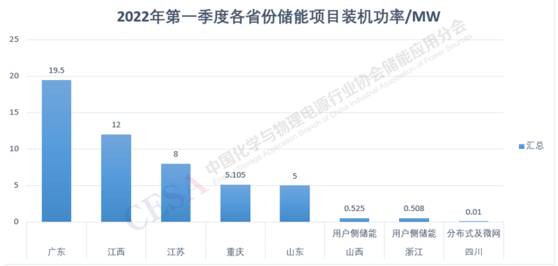 2022年第一季度電化學(xué)儲(chǔ)能裝機(jī)功率top5省份分別是廣東(3個(gè))、江西(1個(gè))、江蘇(2個(gè))、重慶(3個(gè))、山東(1個(gè))。而去年第一季度電化學(xué)儲(chǔ)能裝機(jī)功率top5省份分別是廣東(3個(gè))、青海(1個(gè))、河北(2個(gè))、浙江(2個(gè))、湖南(1個(gè))。