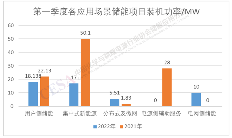 2021-2022兩年間第一季度集中式新能源和用戶側(cè)儲(chǔ)能均占較大比例,但2022年第一季度集中式新能源裝機(jī)功率較2021年相對減少。