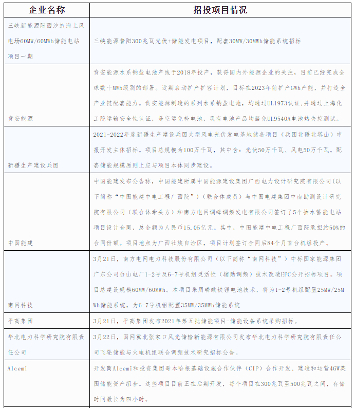 圖表 1 2022年3月國(guó)內(nèi)儲(chǔ)能項(xiàng)目中標(biāo)情況(部分)