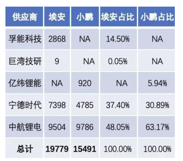 在電池選擇方面,我們可以把小鵬和埃安的情況來做個梳理。這兩家企業(yè)大概的需求量在月度 1-1.5GWh 左右,目前都實現(xiàn)了 3 家供應(yīng)商,而且是前兩家為主,第三位為輔的情況。兩家企業(yè)都圍繞快充電池選擇了獨立的備份,所以還是比較有參考價值的。目前寧德時代都占據(jù)這兩家企業(yè)大概 1/3 的供應(yīng),中航鋰電由于三元電池之前跟蹤比較緊,所以取得了超過一半的訂單分配。