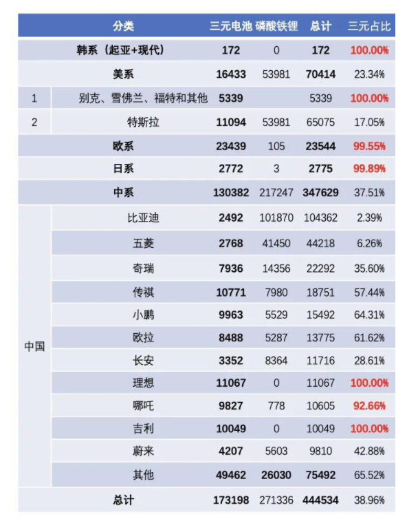 如果從車系來看,特斯拉和中國企業(yè)在乘用車的磷酸鐵鋰的速度部署速度是最快的,三元的占比,比亞迪降低到了 2.39%,五菱只有 6.26%,特斯拉 17.05%,第二梯隊的奇瑞 35.6%、長安 28.61%,蔚來用純?nèi)姵匾仓挥?42.88%。