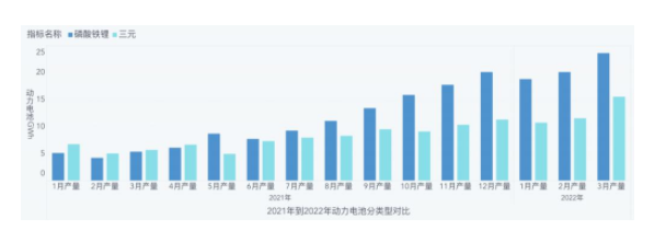 第一季度三元電池累計 38.0GWh,磷酸鐵鋰電池累計 62.4GWh,占比分別是 37.8% 和 62.0%,增速分別是 113.7% 和 317.2%。