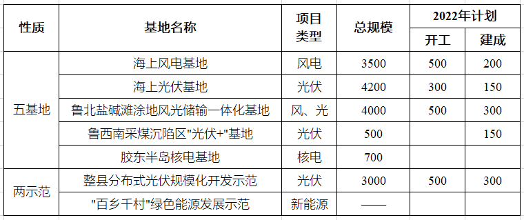 3月3日,山東省能源局印發(fā)《2022年全省能源工作指導(dǎo)意見的通知》中,提出“五基地二示范”的概念,各項工程規(guī)模規(guī)劃如下表所示。