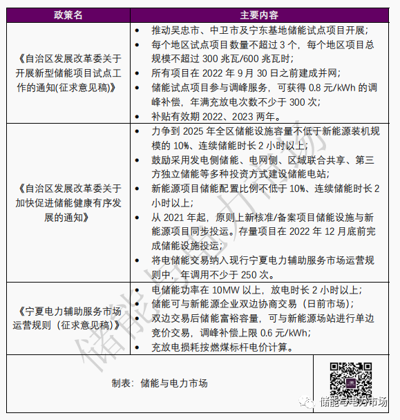 相對于躍躍欲試的項(xiàng)目方,寧夏目前的儲能政策支持力度還較為薄弱。2021年11月、7月、3月寧夏曾分別出臺過《自治區(qū)發(fā)展改革委關(guān)于開展新型儲能項(xiàng)目試點(diǎn)工作的通知(征求意見稿)》、《自治區(qū)發(fā)展改革委關(guān)于加快促進(jìn)儲能健康有序發(fā)展的通知》、《寧夏電力輔助服務(wù)市場運(yùn)營規(guī)則(征求意見稿)》,是主要可參考的文件。