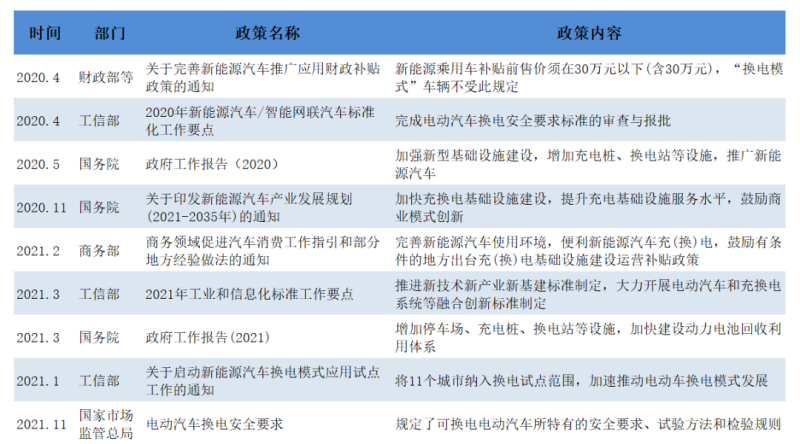 在2020年5月國務(wù)院發(fā)布的《政府工作報(bào)告》中,關(guān)于新基建的內(nèi)容由“建設(shè)充電樁”擴(kuò)展為“增加充電樁、換電站等設(shè)施”,這是換電站第一次被寫入政府工作報(bào)告,亦是換電站首次被納入新型基礎(chǔ)設(shè)施行列,成為我國新基建的七大重要領(lǐng)域之一。此后,多份政府文件均提出大力發(fā)展換電模式。