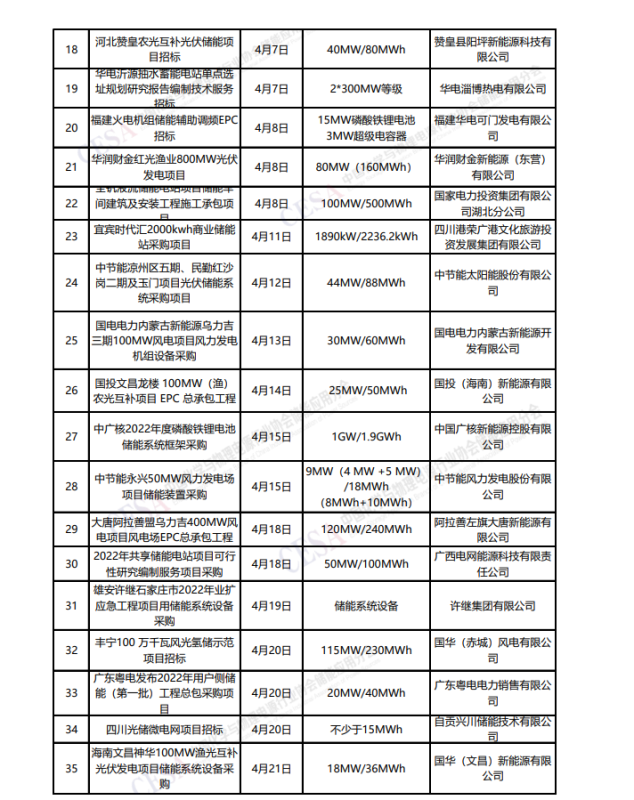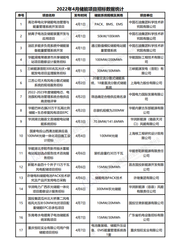 2022年4月份儲(chǔ)能項(xiàng)目招標(biāo)數(shù)據(jù)統(tǒng)計(jì)如下,供業(yè)界同仁參考: