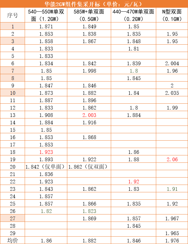 根據(jù)開(kāi)標(biāo)結(jié)果來(lái)看,標(biāo)段一最低報(bào)價(jià)為1.82元/瓦,最高報(bào)價(jià)為1.923元/瓦,均由二線組件企業(yè)投出,整體均價(jià)為1.86元/瓦;標(biāo)段二整體均價(jià)為1.882元/瓦,高出標(biāo)段一約0.02元/瓦左右,最高報(bào)價(jià)已超出2元/瓦。標(biāo)段三整體報(bào)價(jià)最低,均價(jià)為1.846元/瓦,最低價(jià)格來(lái)到了1.8元/瓦,由頭部組件企業(yè)報(bào)出。標(biāo)段四由于為N型組件,整體報(bào)價(jià)最高,均價(jià)為1.976元/瓦,最低報(bào)價(jià)也達(dá)到了1.91元/瓦。