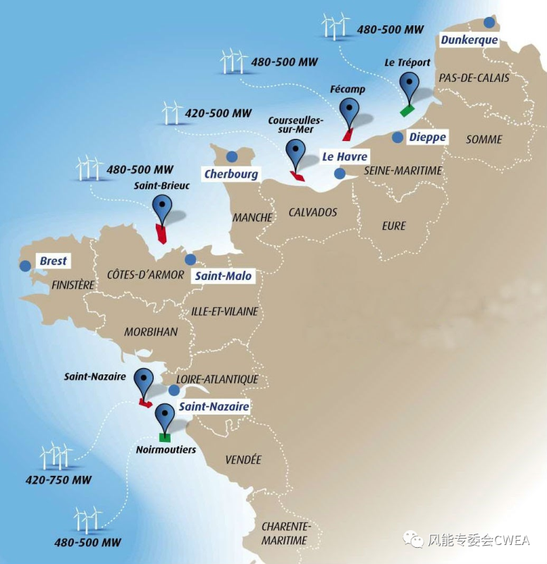 法國(guó)海上風(fēng)電地圖,左下角紅色Saint Nazaire今年將上線