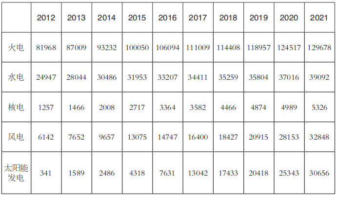 表3 2012~2021年全國電力裝機結(jié)構(gòu)(單位:萬千瓦)