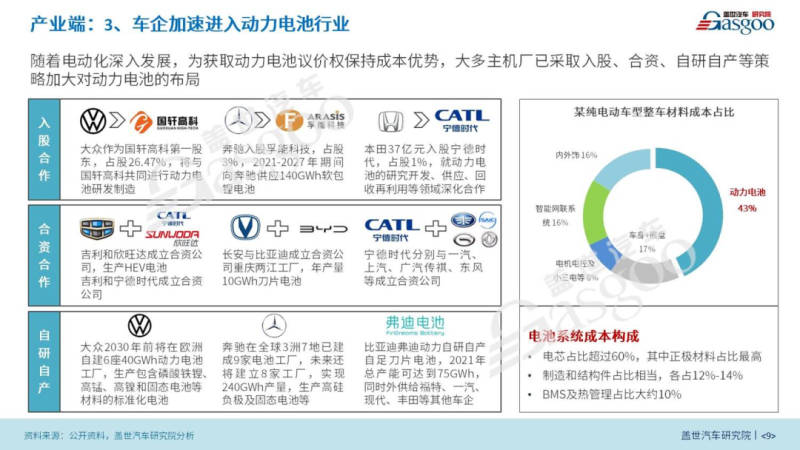 再次,面對(duì)國際動(dòng)力電池市場格局穩(wěn)定、動(dòng)力電池原材料漲價(jià)形成的不可控因素以及動(dòng)力電池成本占純電動(dòng)車40%價(jià)值帶來的挑戰(zhàn),主機(jī)廠為掌握動(dòng)力電池的主動(dòng)權(quán),目前,國內(nèi)外主流主機(jī)廠或采取入股合作、合資合作、自研自產(chǎn)等策略來加大對(duì)動(dòng)力電池的布局。如大眾入股國軒高科,目前已占股26.47%,成為國軒高科第一股東;吉利與欣旺達(dá)合資建廠;大眾和奔馳的自主研發(fā)布局等。未來,隨著電動(dòng)化的進(jìn)一步深入,會(huì)有更多主機(jī)廠加大對(duì)動(dòng)力電池的自主研發(fā)布局。