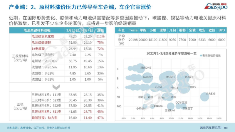 其次,面對(duì)長期以來的動(dòng)力電池供需錯(cuò)配、全球疫情以及2022年俄烏突發(fā)事件的影響,近期動(dòng)力電池正極原材料中的碳酸鋰、氫氧化鋰和鎳資源均迎來大幅漲價(jià)。據(jù)鑫欏鋰電統(tǒng)計(jì)數(shù)據(jù)來看,相較于2022年1月初,今年3月底的氫氧化鋰和碳酸鋰分別增加了112%和75%,達(dá)到接近50萬元/噸的價(jià)位,電解鎳也增加了72%,達(dá)到16萬元/噸的價(jià)位,使得三元和磷酸鐵鋰等主流電池的正極漲價(jià)了35%-47%。同時(shí),價(jià)格壓力逐級(jí)傳導(dǎo),目前國內(nèi)已有不少車企進(jìn)行多輪價(jià)格上調(diào),如特斯拉、零跑和小鵬上調(diào)后的平均售價(jià)漲幅約2萬元左右。隨著這一波漲價(jià),或許會(huì)影響2022年新能源汽車的終端銷量,但考慮到近期原油價(jià)格同期上漲以及今年是補(bǔ)貼最后期限,漲價(jià)帶來的銷量影響有限。