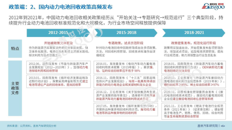我國除了有明確的產(chǎn)業(yè)發(fā)展目標(biāo)之外,針對(duì)動(dòng)力電池的回收,我國同樣沒有落下。早在2012年,我國就開始關(guān)注動(dòng)力電池退役后的梯次利用和回收問題,只是當(dāng)時(shí)并沒有實(shí)質(zhì)性動(dòng)作;直到2016年,發(fā)改委和國務(wù)院以及工信部先后發(fā)布三份關(guān)鍵文件,正式進(jìn)行我國動(dòng)力電池重點(diǎn)企業(yè)的培育并啟動(dòng)梯次利用和回收的試點(diǎn)示范。而后隨著我國首批新能源汽車的陸續(xù)淘汰,到2018年后,我國動(dòng)力電池回收進(jìn)一步規(guī)范化,如先后明確了OEM的主體責(zé)任地位,鎳鈷錳、鋰和其他金屬的綜合回收率,并制定電池編碼進(jìn)行全生命周期資產(chǎn)管理,使我國動(dòng)力電池產(chǎn)業(yè)迎來了規(guī)?;l(fā)展,為行業(yè)市場空間的釋放提供有力保障。