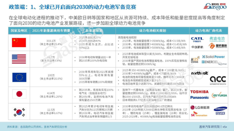 從政策背景來看,隨著中美歐日韓等國家確定了新能源汽車發(fā)展的主體地位后,各國新能源汽車市場表現(xiàn)總體向好,滲透率持續(xù)提升。同時(shí)各國為確保下一階段汽車的領(lǐng)先地位,也制定了極具挑戰(zhàn)的新能源汽車規(guī)劃目標(biāo),這使得各國汽車產(chǎn)業(yè)對(duì)動(dòng)力電池需求的空前高漲。于是,各國政府圍繞新材料體系、能量密度和循環(huán)壽命提高和成本降低先后制定了面向未來的動(dòng)力電池產(chǎn)業(yè)規(guī)劃,以期掌握未來的主導(dǎo)權(quán)。如中國在《節(jié)能與新能源技術(shù)路線圖2.0》中明確到2035年高性能電池能量密度>500Wh/kg,成本<0.4元/Wh;美國明確未來電池將朝無鈷無鎳發(fā)展,2030年量產(chǎn)固態(tài)電池和鋰金屬電池;歐盟則計(jì)劃在2025年量產(chǎn)第三代鋰電池和2030年量產(chǎn)第四代鋰離子電池;日本和韓國則將加速全固態(tài)電池的商業(yè)化。