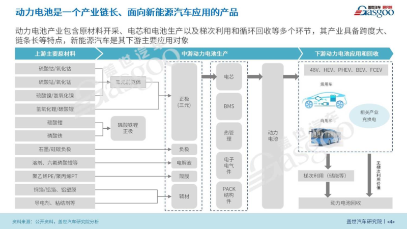 從產(chǎn)業(yè)鏈來看,動(dòng)力電池包含上游原材料開采,中游動(dòng)力電池生產(chǎn)和下游動(dòng)力電池應(yīng)用和回收等多個(gè)環(huán)節(jié)。其中,動(dòng)力電池原材料涉及面非常廣,如電芯生產(chǎn)端就包含生產(chǎn)三元正極的鎳鈷錳、碳酸鋰或氫氧化鋰等原材料,也有生產(chǎn)磷酸鐵鋰正極的碳酸鋰和硫酸鐵,還有制備隔膜、電解液以及隔膜等相關(guān)原材料。而生產(chǎn)過程主要包含電芯、BMS、熱管理和殼體以及動(dòng)力電池產(chǎn)品等制造。動(dòng)力電池以新能源汽車應(yīng)用為主體,在電池容量低于80%限值后則進(jìn)入梯次利用和循環(huán)回收,回收后的材料又能再一次用于原材料生產(chǎn),形成全生命周期閉環(huán),避免對(duì)原材料開采過渡依賴,確保供應(yīng)安全。