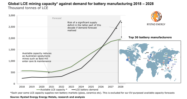 從目前的產(chǎn)能情況來看,供不應(yīng)求的局面很難在短時(shí)間內(nèi)逆轉(zhuǎn)。據(jù) Rystad Energy 預(yù)計(jì),如果目前的采礦項(xiàng)目管道保持不變,那 2028 年的采礦能力預(yù)計(jì)只能達(dá)到 200 萬噸,而制造商的鋰需求將達(dá) 280 萬噸。