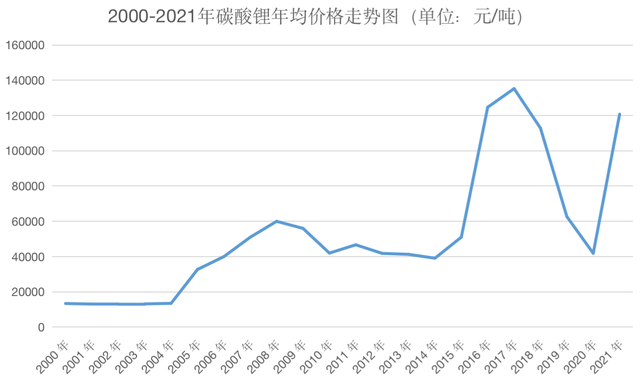 鈦媒體APP整理了碳酸鋰自 2000 年以來的年均價(jià)格的走勢(shì),可以看出,盡管不同時(shí)期價(jià)格有所波動(dòng),但其最高價(jià)格也僅停留在 13 萬/噸——與如今的 50 多萬/噸相差甚遠(yuǎn)。